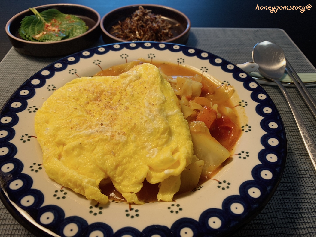 - (차리기) 밥에 3. 의 카레를 붓고, 스크램블 계란 등 원하는 재료를 만들어 얹어준다.