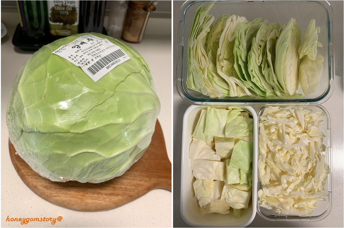 장보기 물가가 무척 오른 요즘, 양배추 한 통을 세일가격에 샀다.
