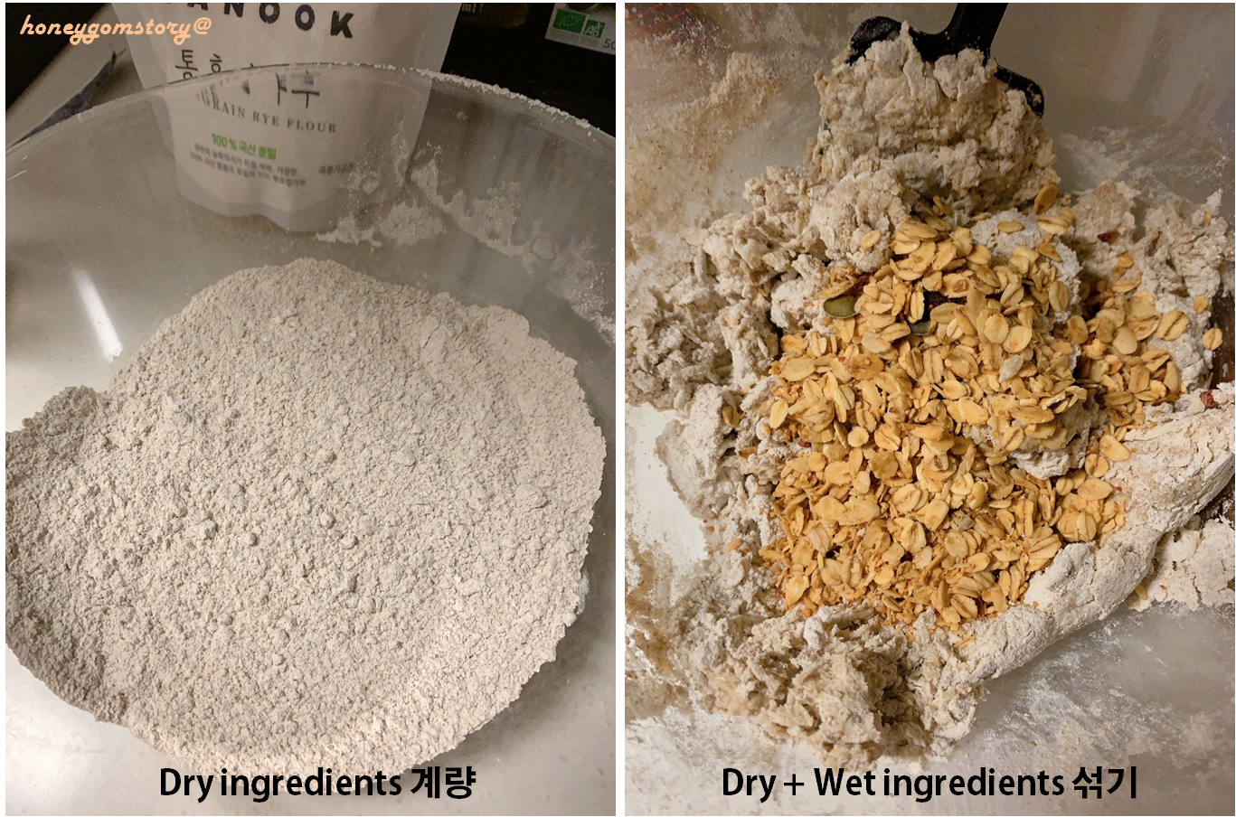 - 호밀가루, 강력분, 소금, 오트밀 or 견과류(생략가능) 을 계량하여 보울에 섞어놓는다.