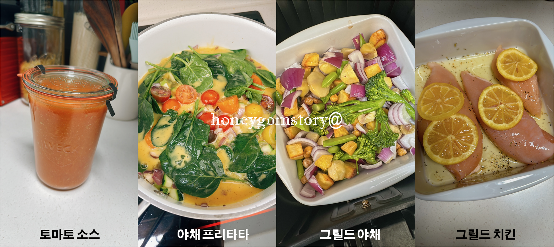- 그릴드 야채 - 고구마, 양파, 호박, 감자, 밤, 삶은 콩 등 다양한 야채 및 곡류를 조각내어 올리브오일, 소금 후추 등으로 버무려 오븐, 에어프라이어로 3-4회분 조리, 사이드 side로 활용