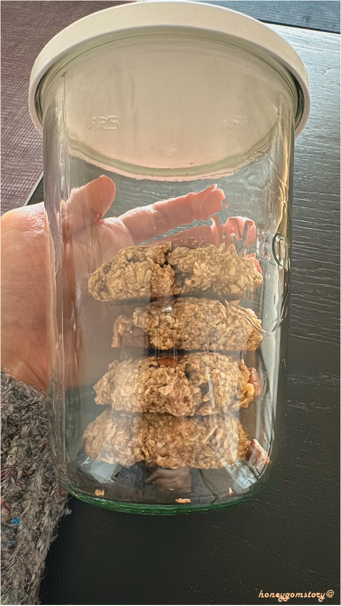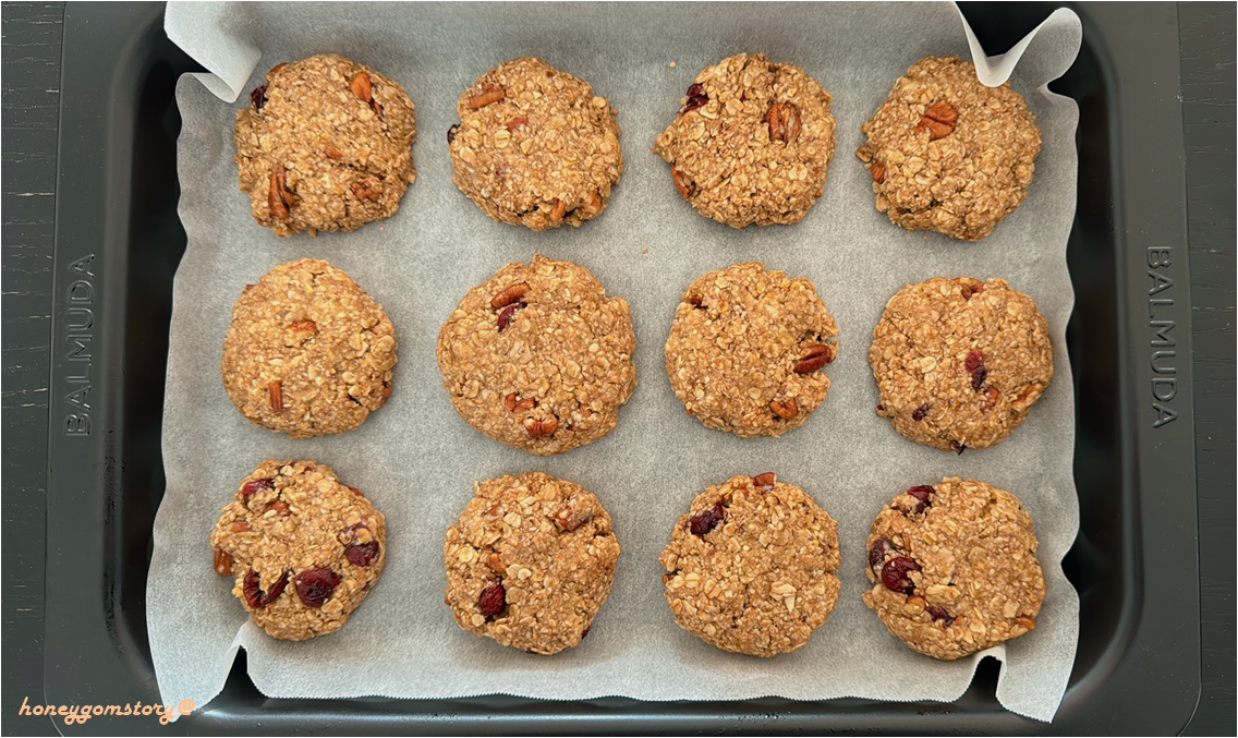 그럼에도 완전히 끊을 수 없다면 최대한 줄여 보고자 노력하고, 내가 만든 검증된 재료로 달달이 간식을 대체한다. 정제 밀가루가 좋지 않다니 밀가루를 대신하여 오트밀을 사용한 다양한 베이킹이 시도된 지 오래이다. 과거에 오트밀 하면 떠오르는 이미지는 정말 맛없는 다이어트 간편식이었다. 그런데 이제 다이어트를 위해 먹는 것은 옛말이고, 압착귀리는 하나의 레시피 재료로 자리매김하고 있다. 나도 최근 1년 사이 오버나잇 오트밀을 만들어 아침이나 브런치로 많이 먹었고, 베이킹에도 간혹 사용하고 있는데, 이 오트밀 쿠키를 만들고 나서는 사용량이 더 늘어날 것 같다. 만들기도 너무 쉽고, 포만감도 있고, 건강을 생각한 우리 집 달달이 상비간식이 되었다. 오트밀을 싫어하던 곰돌도 "대량생산"에 들어가라고 말할 정도니 맛은 보장된 것이다. 유제품과 달걀이 들어가지 않아 비건 디저트로도 적합하다.