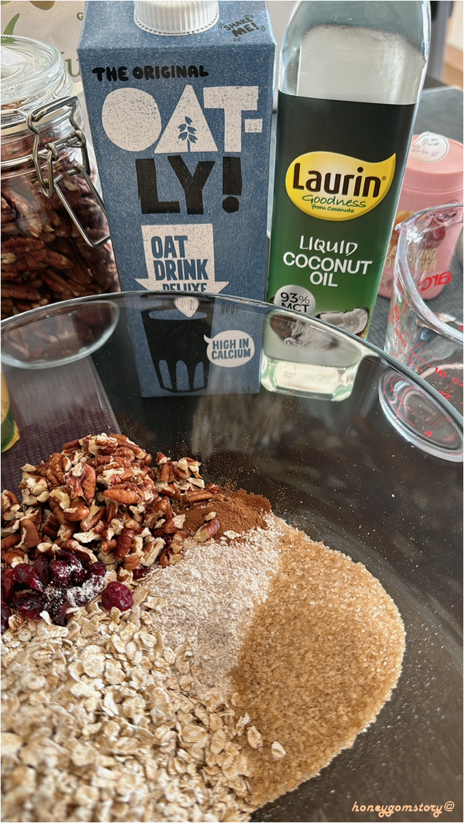 - 믹싱보울에 dry ingredients(가루류, 건과류, 건과일 등)를 모두 계량하여 넣어준다.
